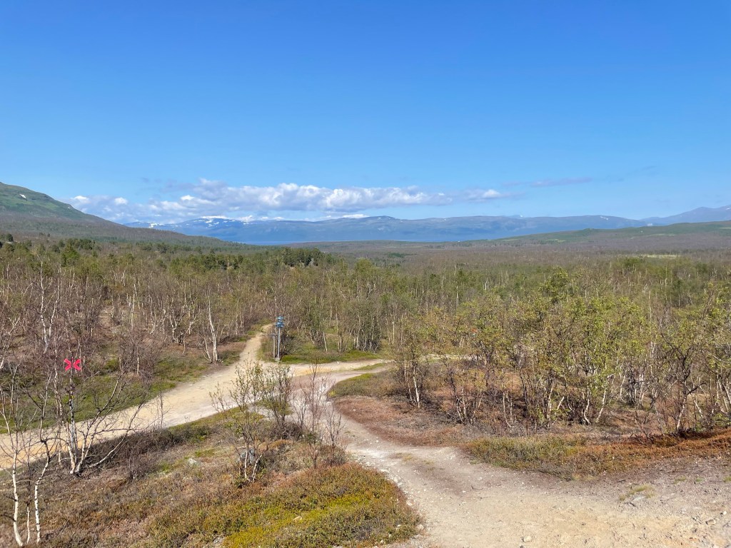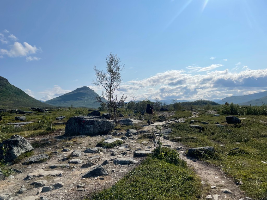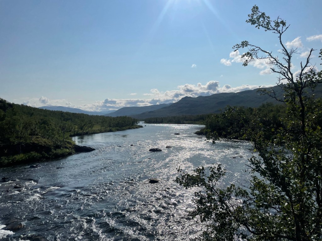 The trail with rocks to avoid is frequently swapped with boardwalks. The summer trail and the winter snowscooter trail intersect each other very often, but apart from that, navigating was easy and compare to the book we made really good time, but seeing that we started at 11 we got to the hut at five-ish which is a paid camp side, so we decided to continue until we left Abisco national park and we are now camping on a kind of designated side, which has a toilet and a fast flowing river which made for a really nice and really cold bath.