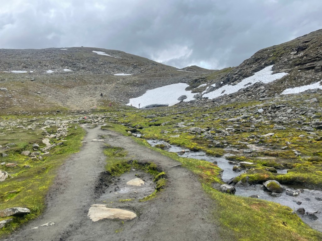 After the late start, the trail was easy going and we passed the Tjäktja Fjällstuga. Decided not to leave the trail to visit the hut because it was too earlier for a break. We continued the gentle climb further to Tjäktja Pass (1150m) where there was even the tiniest snow patch left. Just before the last 25m climb, we saw the Korean couple we met on the train. So we had a brief conversation and we both felt amazement that they were ahead of us. We didn’t see them after we left before them from Abisko. But never again will I underestimate a 60-year-old Korean who looks no older than 40 and who completed 103 marathons.