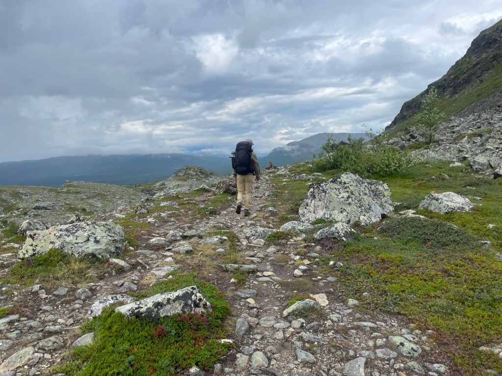 According to an American family, we were ‘close to the next hut’. Surely not because it took another hour and a half and to me that is not close. We got there in the end. Had a break and on we went. The Kungsleden book told us the trail would be similar, with the most rocks along the lake.