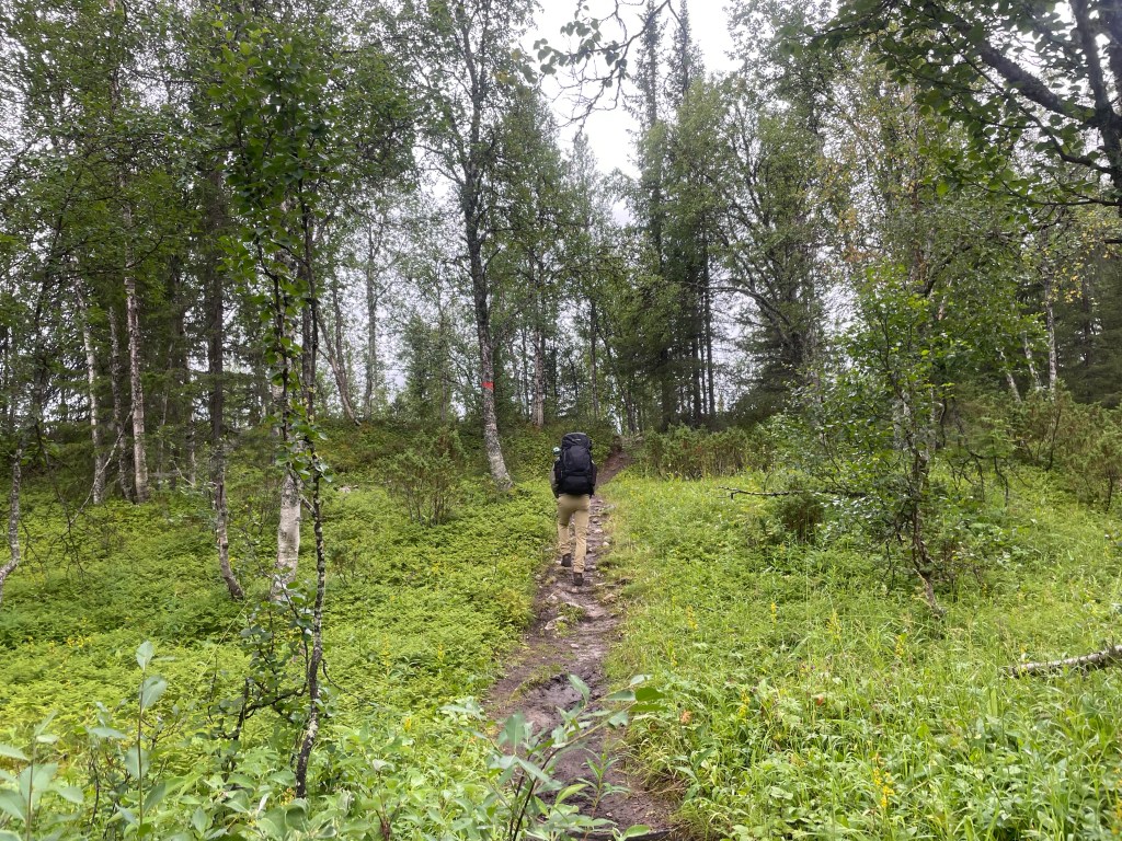 The thunder and most of the rain missed us. So it turned out to be a fine night. We got up and packed everything as usual. However, today would be Donald’s last day. Very sad to lose my compagnon, but glad that we made it in time to Kvikkjokk. Or at least we still had to walk 20+ km, but we could do that. First 10km to the last hut and then 14km to Kvikkjokk. The route would be through the forest for nearly all. Which means no grand views and a lot of roots and rocks to step over.