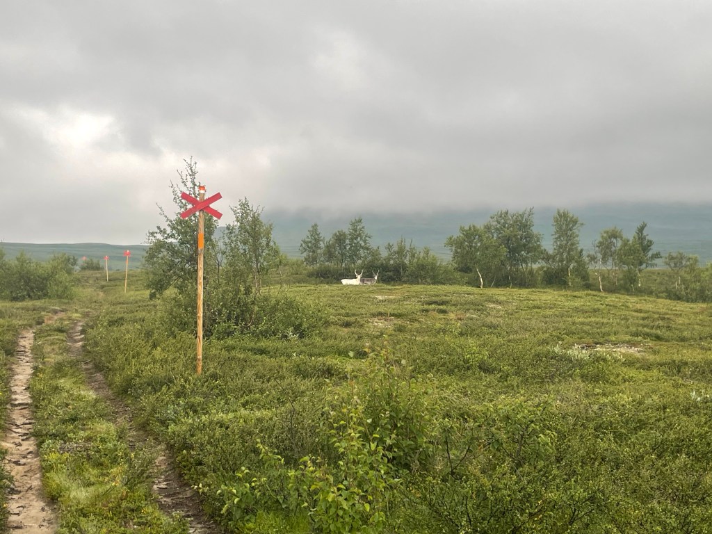 The trail goes over the next ‘ridge’ (it’s the top of the mountain, but it’s so wide that you cannot really call it a ridge). From the hut, I could already see that most of it was in the clouds. It was clearing up but at a very slow pace. So I anticipated more views being blocked by clouds. When hiking up I could see the French couple and more reindeer. So far I’ve seen them nearly every day. I still get excited and make a whole photo shoot, live photos, and videos.