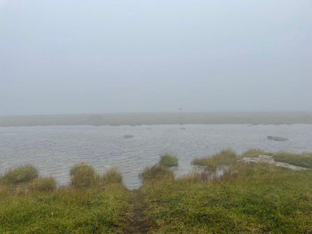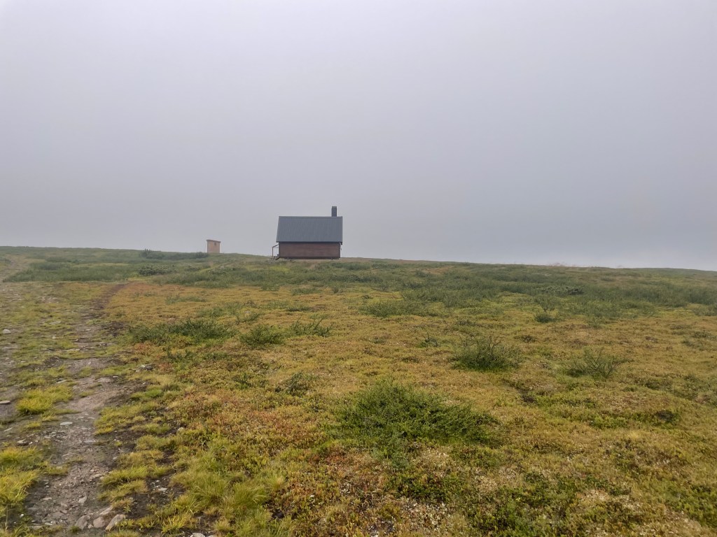 I reached the ‘ridge’ and it was still in the clouds. No views but the trail did go through a small tarn. As my feet/shoes were already soaked, like every day, I just went straight through. But I did find it hilarious that the trail casually goes through a tarn, like no biggie. Halfway on the ridge, there is an emergency shelter which would be a perfect spot for a break. I arrived shortly after the French couple. We chatted and ended our break at the same time so we continued together.