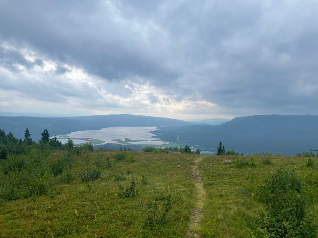 Reaching the last peak along the ridge, the weather cleared up enough that there was a view. So I had a second break. It was around lunch time but it was also only 5km left. So I figured I would go to Ammarnäs and buy something there.