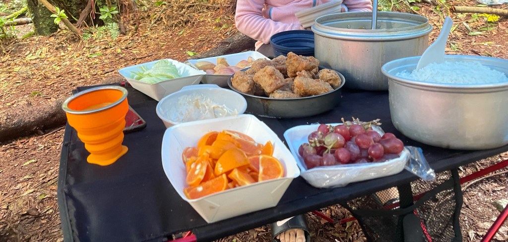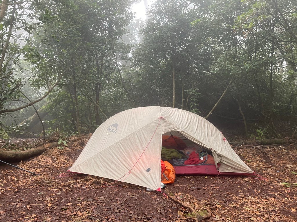 Flor brought a tarp which we used over the sitting area. This was a good decision because it rained in the afternoon. So underneath the tarp, we could eat our dinner dry. Unfortunately, the rain intensified as water was already seeping a little bit through the floor of the tent I was worried. The floor was explainable because even though we were on a slope and not the lowest point. Still, a puddle formed. The large raindrops sometimes penetrated through the outer fly. Giving a little spray that would come in the tent. I was so so so worried. My down-sleeping back is not supposed to get wet. I did get out to assess the situation. I created a trench that drained the puddle. Re-pitching the tarp over the tent or relocating the tent would be a hassle and probably get us more wet than it would be useful. So unless rain came straight through I didn’t want to do anything.