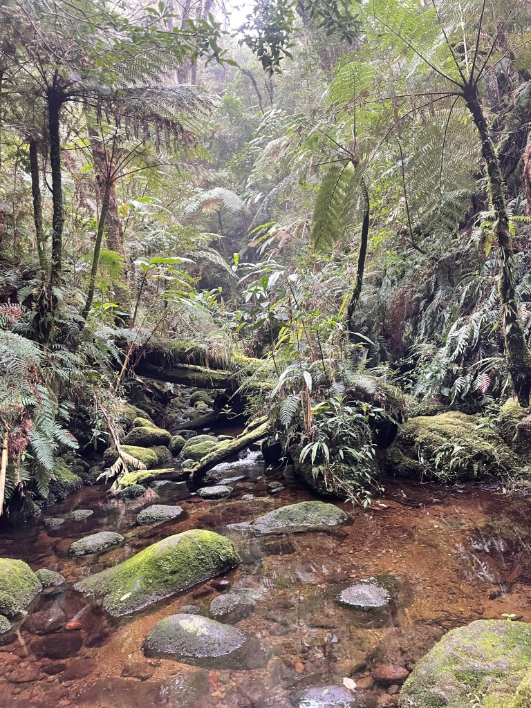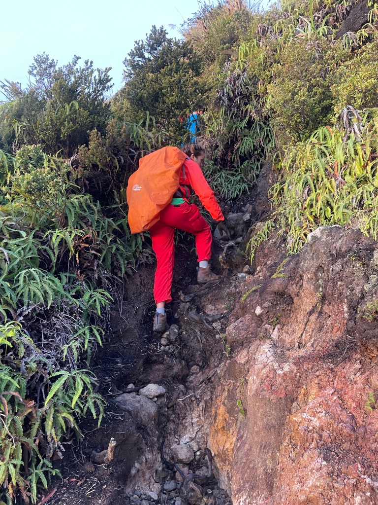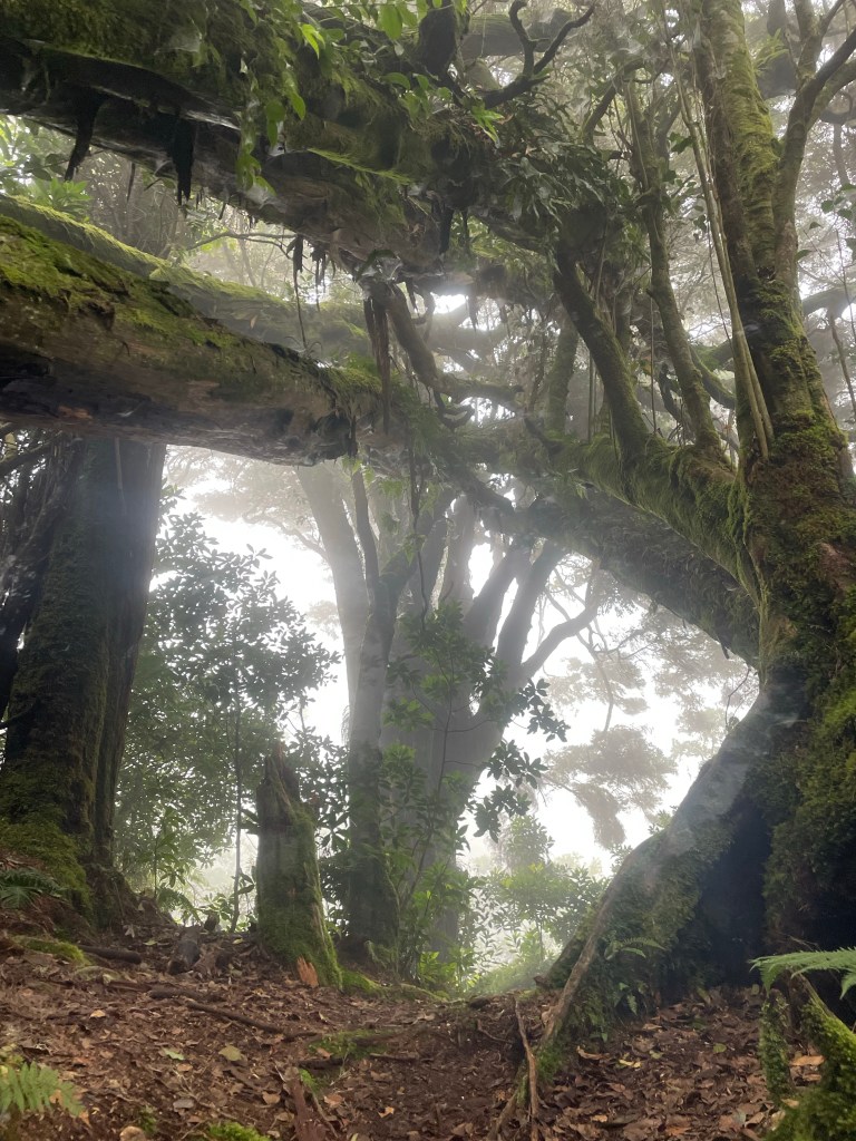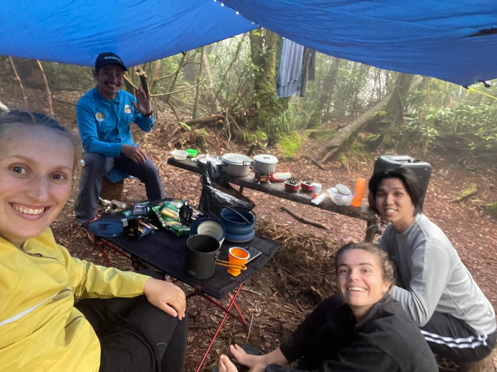 After another delicious lunch, we set off. The fog had come again and soon the tropical rain came. The temperature and getting wet weren’t the issue. The trail became so so so so so so slippery! I did fall a few times and on one of the falls I twisted my knee slightly wrong. Nothing too serious but definitely something to be careful about as I want to hike way more miles! After a stupid decision by stepping from one slippery fallen tree to another while there wasn’t anything to hold and I wobbled and to stop myself from falling 1m down, I tensioned my whole body. My knee did NOT agree with this and started to hurt whenever I would slightly bend my knee. It took 5 minutes for me to be able to set aside my pride and asked for a break so I could apply tape. Luckily the guide was prepared and gave me a kneeband. It didn’t take the pain away. Duh, it’s no painkiller, but it took away my fear of injuring it further. I decided not to take painkillers. If I prevented bending it didn’t hurt and I take those pain signals very seriously. There was no good reason to push and risk injuring myself more. So based on the pain I continued slowly down.