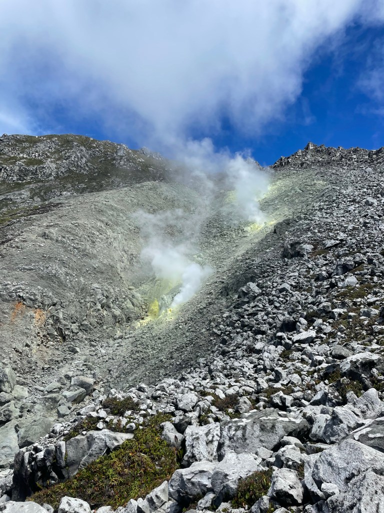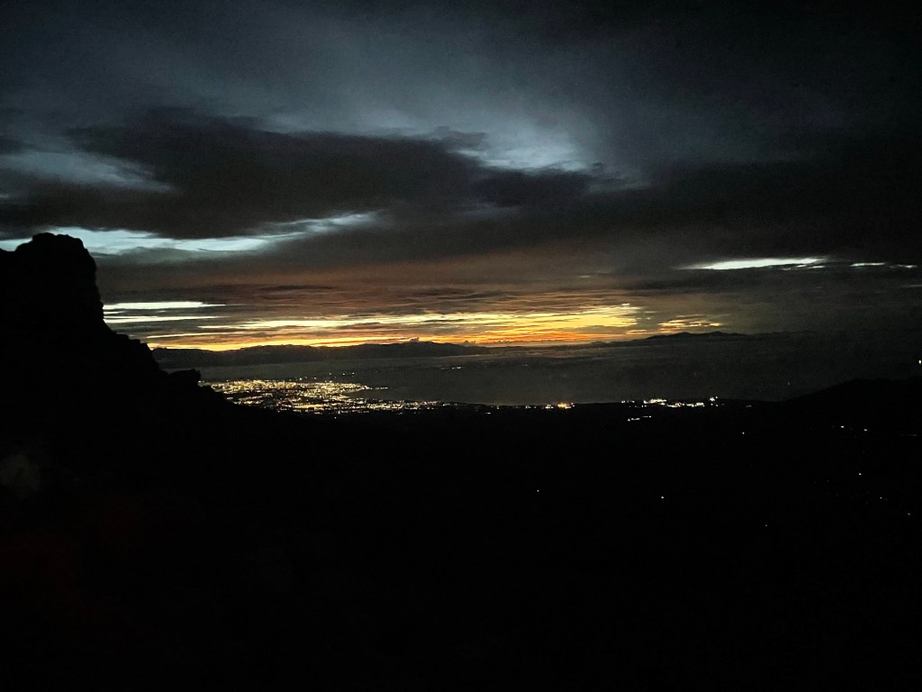 The night hike was great. By myself, I would be so scared from all the weird tree shadows and I would be scared to get lost. But Joel was here to guide us up and with 5 headlamps, it wasn’t that dark. Soon after we started I struggled a bit. The height, the climb, the terrible sleep, and, what I didn’t realize, a lot of Sulphur in the air from the vents of the volcano. When looking at the city lights in the valley, you can see the air being hot, as you see above heated tarmac. I used my buff as a mask which helped. 10 minutes later my body was accustomed to the hiking and the air and it was much easier after that.
