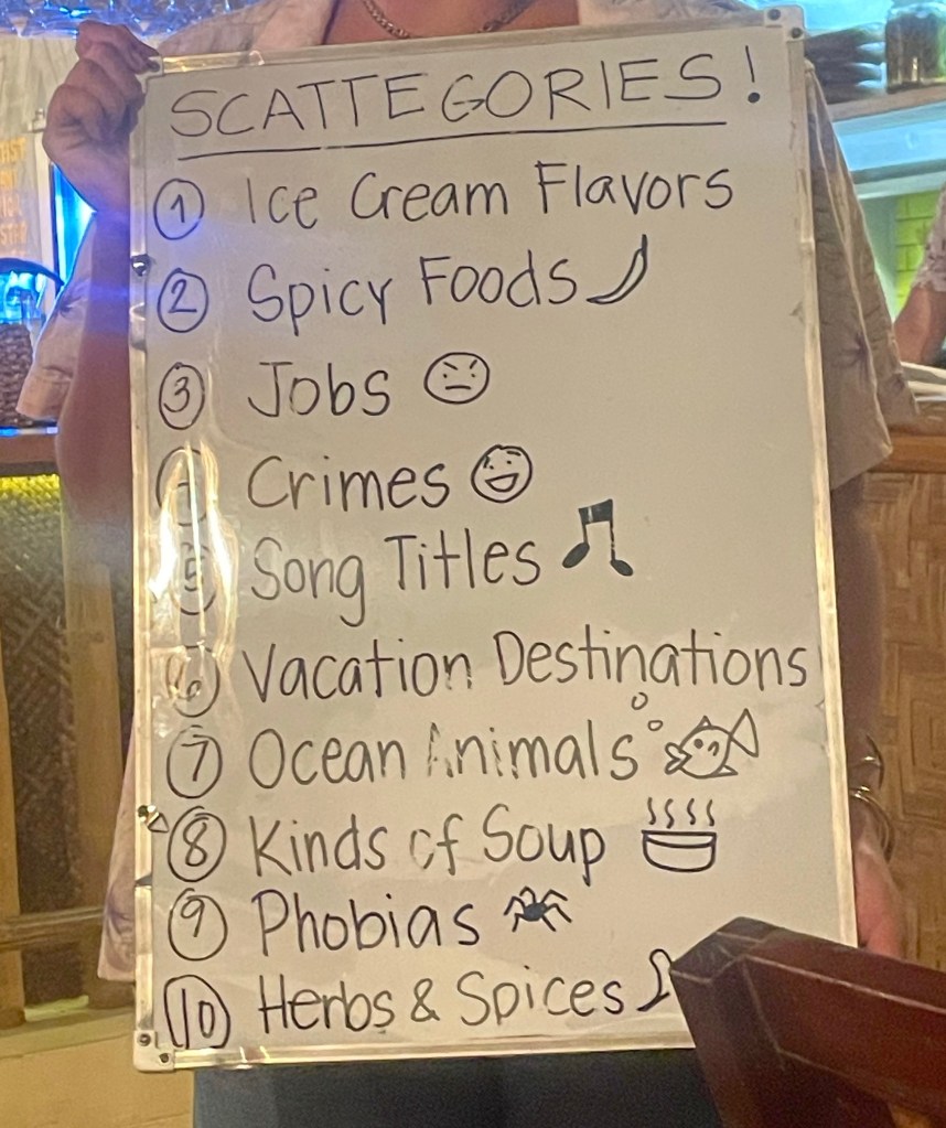 In the evening we did another quiz ‘category’. This time with the support of Steffie. Or as the locals would call hete Sophie. 10 different categories you need to name a right answer with the letter that is drawn. If your answer is correct and no one else thought of it, you get a point. Surprisingly we got a point for ice cream flavour with an ‘A’ Ananas. Which made us laugh very hard.
