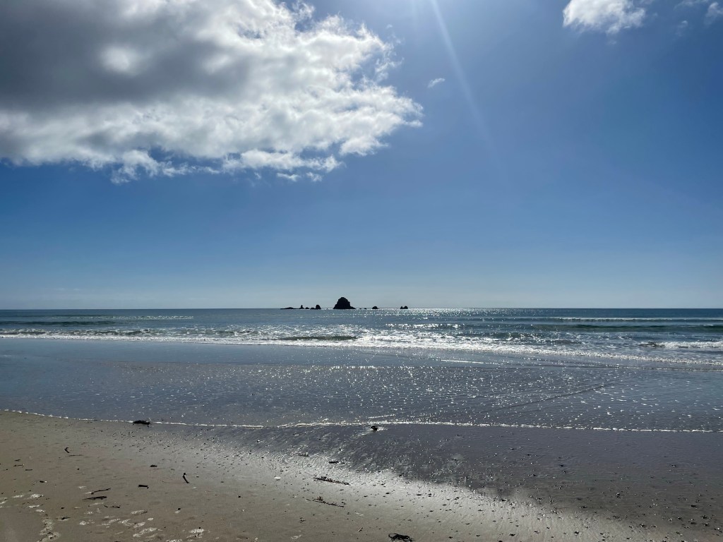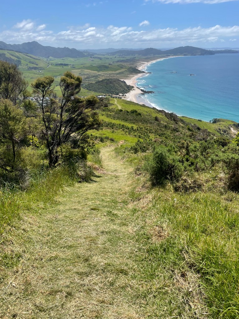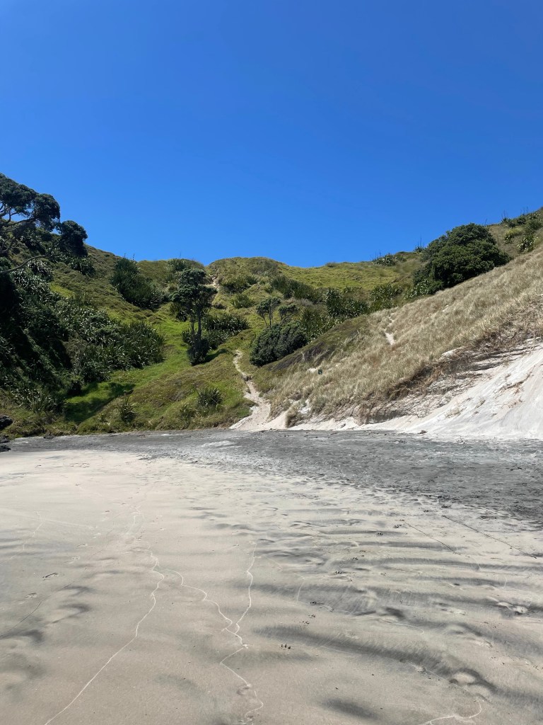 After the estuary, there is the warm uphill to 300m. Then you drop down to the beach and walk to Bream Head.