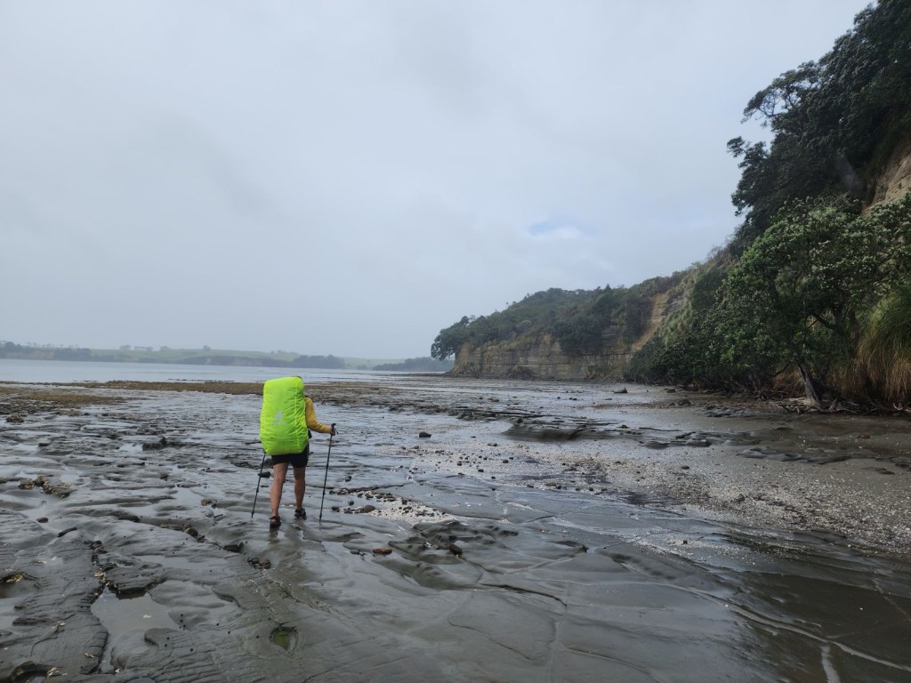 Today is one of the deepest tidal crossings. Low tide at 11 am and with only 3.5 km to the crossing, this means a late start. I was glad to be sleeping inside because it was raining in the morning. Just when we left at 9 am, the rain cleared. Immediately after leaving the campsite, Te Araroa follows a trail. Bit muddy but I walked on my sandals to keep my shoes dry till after the crossing. I had a small slide in the mud, so I walked carefully on the rocks approaching the estuary crossing. I walked with Tim. Ron was right behind us and Carry was waiting another hour to cross exactly at low tide.