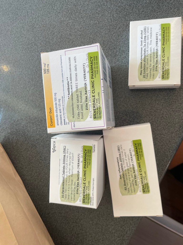 Finally around 4:30 pm (after almost 6 hours) I was ready to leave. Getting my prescriptions in the pharmacy (another week of antibiotics and painkillers) and taking the bus to Auckland.
