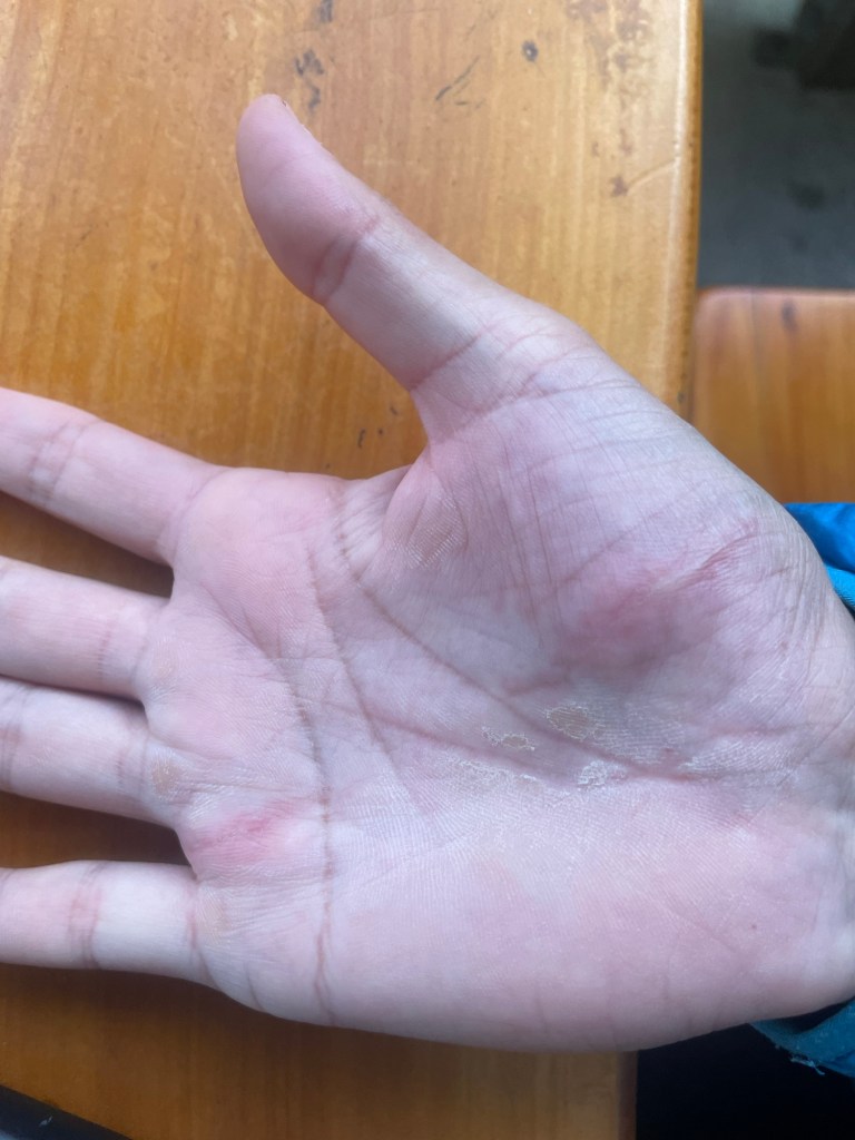 Tim directly asked if I was alright. I saw a bit of blood on my left hand and right knee. No extreme pain. So I said I was fine. Until I saw my right hand. I saw a deep cut on the palm of my hand. So deep that I immediately felt dizzy and went into panic mode: ‘Ooh nononono’. Tim came quickly and suddenly Ron was there too. He stood behind my back so I would fall because I was close to fainting. They put down a foam pad so I could lay down and I felt immediately better.