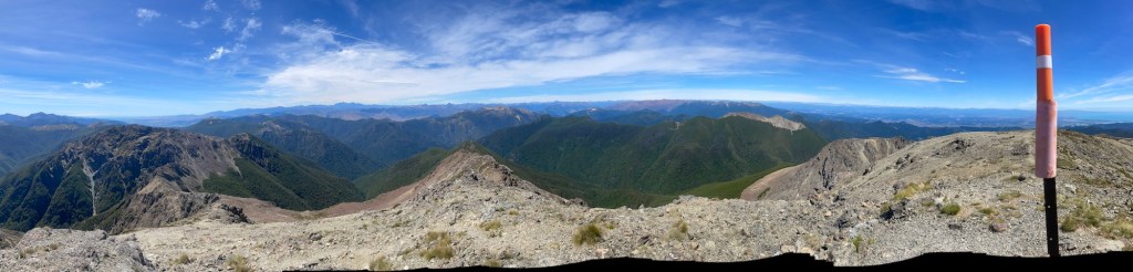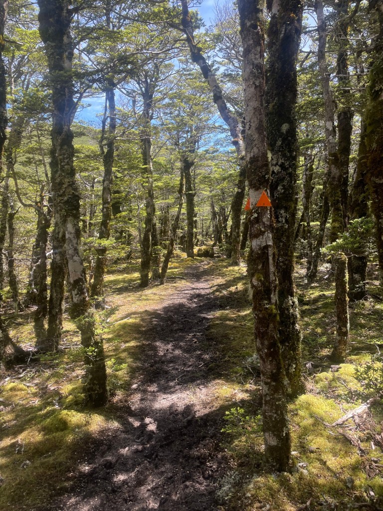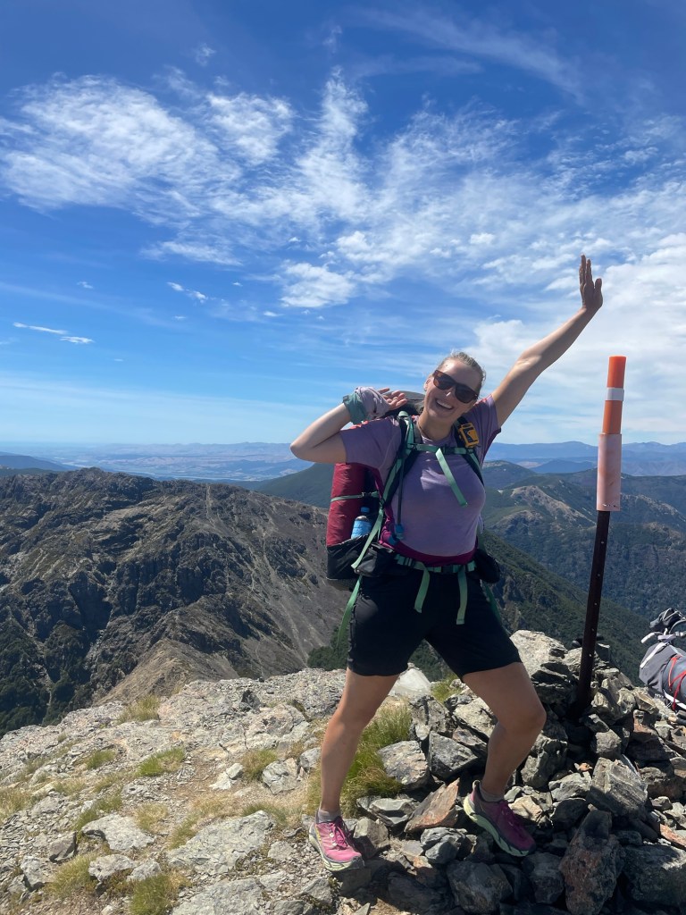 I prefer uphill at all times and soon I got into a rhythm and I reached the top in no time. I enjoyed the view as it was well-earned! There is also reception so I was able to check the weather forecast. The next few days will be sunny and I’m certain I’ll finish the Richmond ranges on the 12th. Seeing that I only recently started hiking again, a rest day in St Arnaud is probably wise. So I made a booking at the Alpine Backpackers. Anna reached the top as well and after a photo shoot and another soaking in the views we continued.
