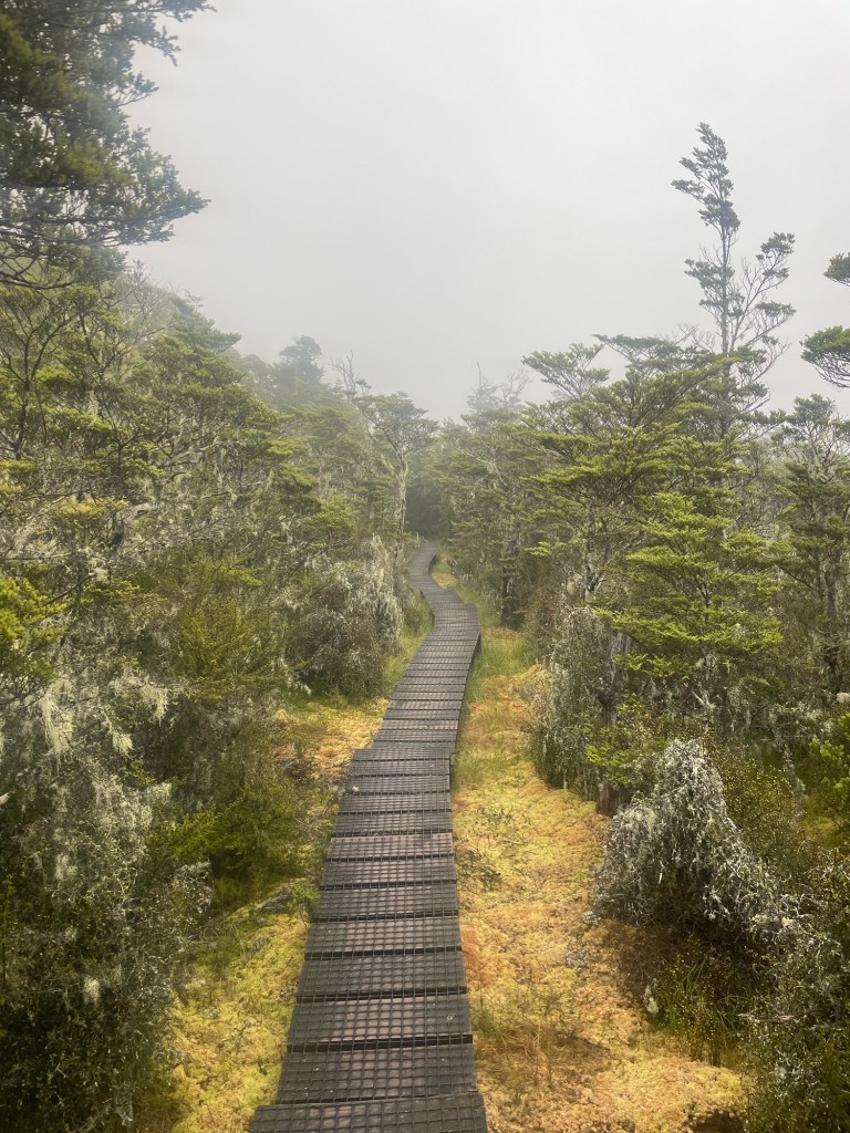 The weather wasn’t that bad after all. The trail was fine, but with slippery roots always a bit slower. Also brushing through the scrub makes you instantly wet, so I was glad I put my raincoat on and covered my backpack. The only thing wet were my feet. Not great but expected in NZ.